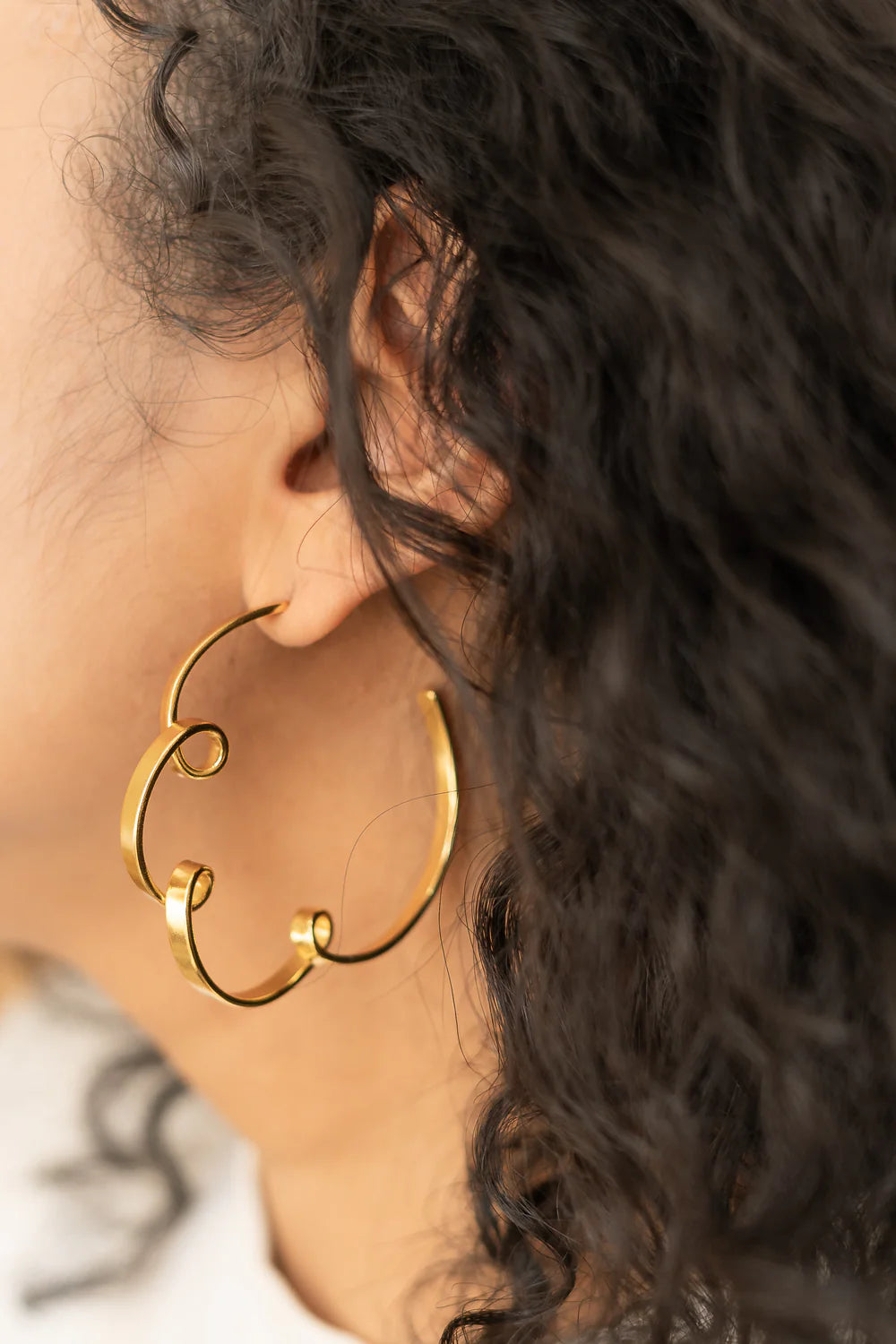 Looking to up your style game with some hoops? Grab these playful and elegant Kaya hoops that are sure to add a modern edge to your outfit. With a unique, curly silhouette, the Kaya hoops look elegant with both casual and formal outfits. Lightweight and comfortable, these earrings are handmade from brass with a luminous 22k gold plating.