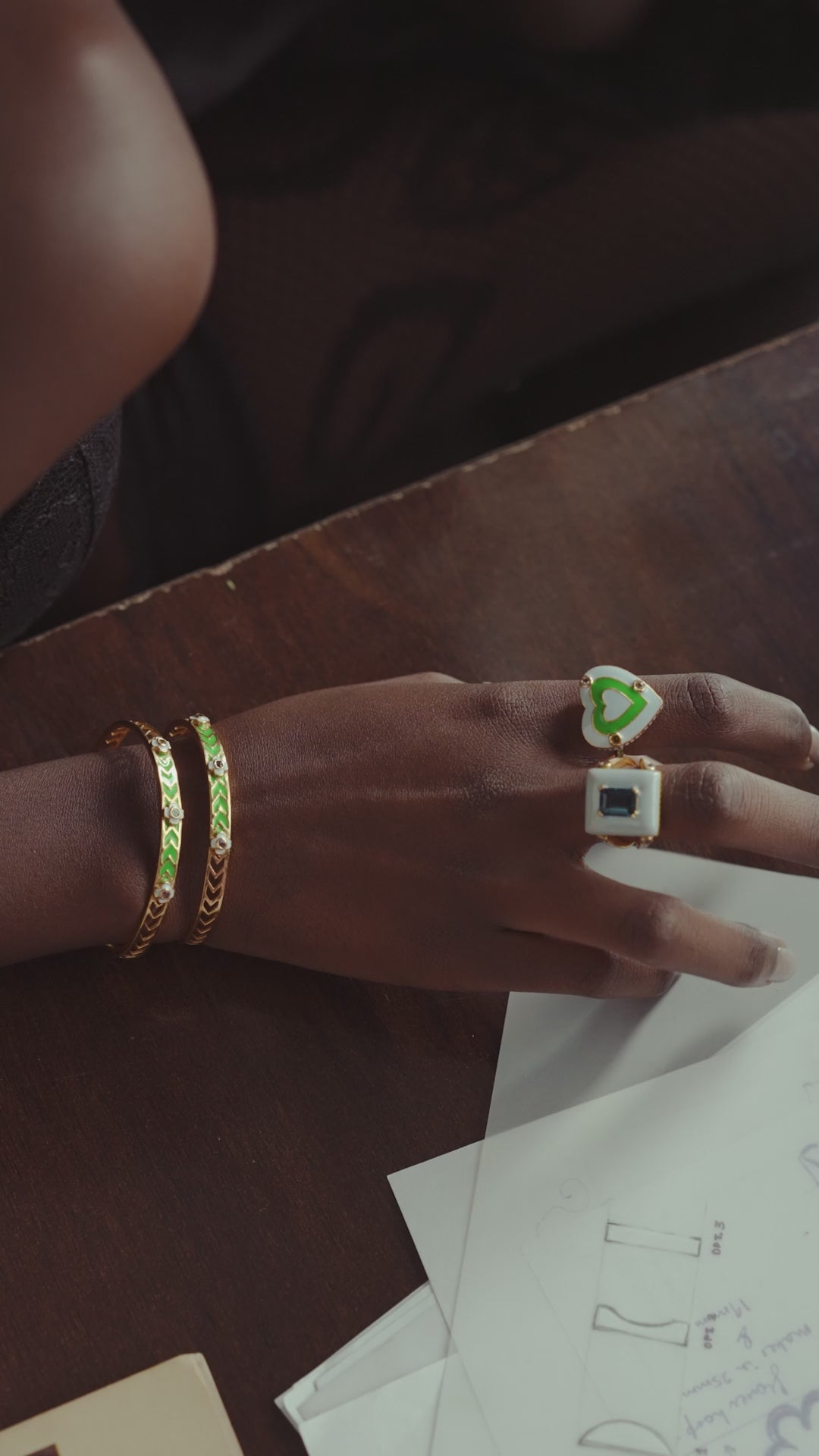 Riviera bangle cuffs are crafted in sterling silver and enhanced with fresh colourful enamel and multi colour tourmalines. La Palma pieces capture an idyllic confluence of form, shape and colour.